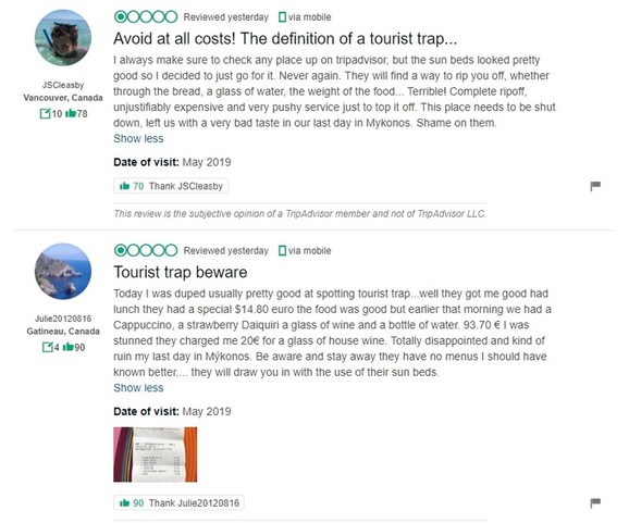 Da su upali u zamku smatraju još neki gosti ovog restorana koji su objavili svoja neugodna iskustva sa restoranom. Džuli iz Kanade napisala je da su joj naplatili kapućino, daikiri, čašu vina i bocu vode 93.70 evra.